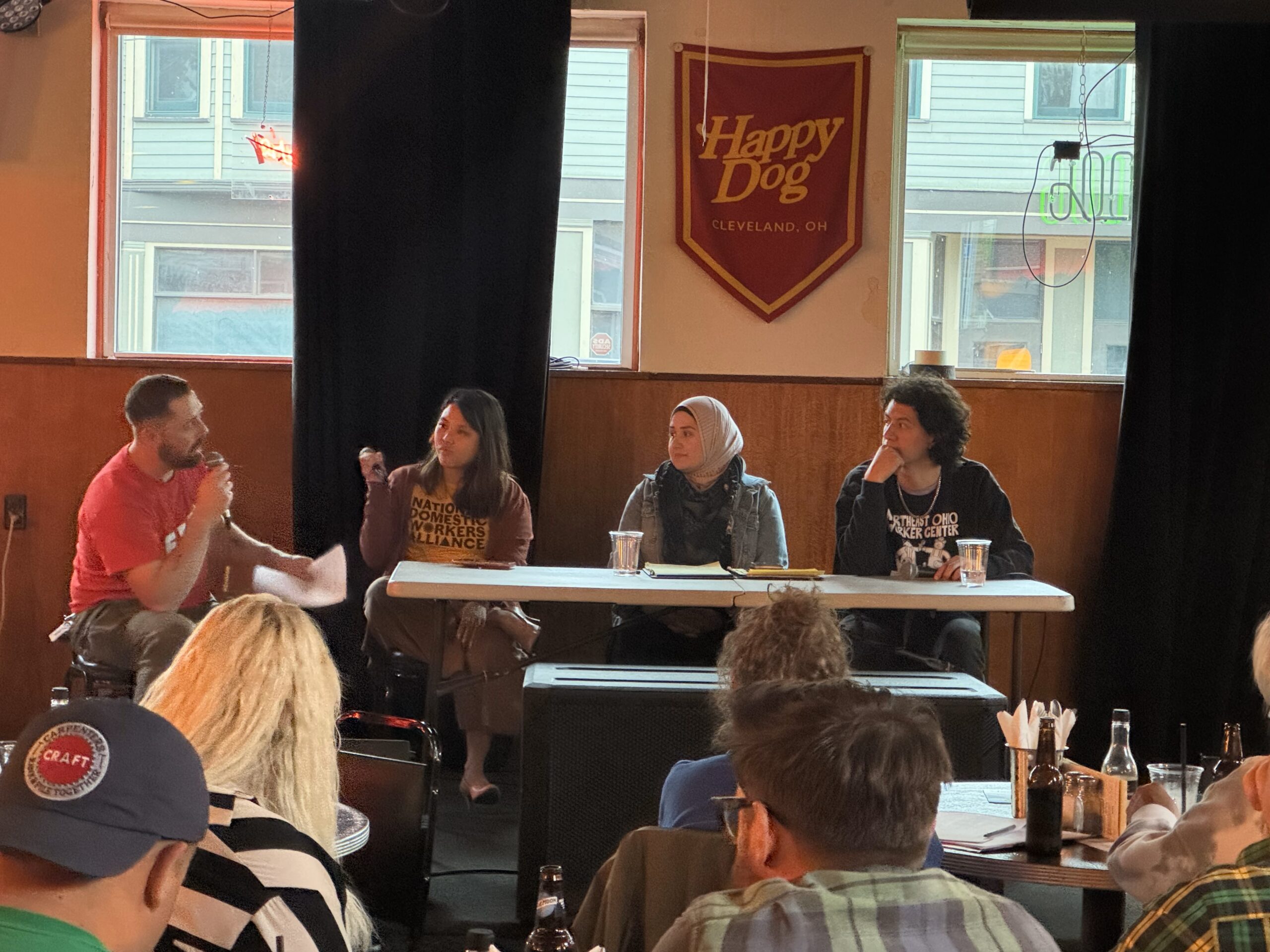 (CLEVELAND, OH – 5/29/25) – On Tuesday, May 27, 2025, in response to the recent attacks held against immigrant workers by the ICE raids, the criminalization of free speech, and the weaponization of immigration status, Neoworker Center hosted a solidarity session with CAIR-Ohio Executive Director-Faten Odeh, along with Director of Major Gifts, National Domestic Workers Alliance-Larisse Mondok, and Ohio Worker Center organizer- Ricardo Morales Vivero at Happy Dog in order to examine how federal attacks are being used to divide workforces. Along with teaching about how immigrant workers and allies are fighting back and resisting these attacks.